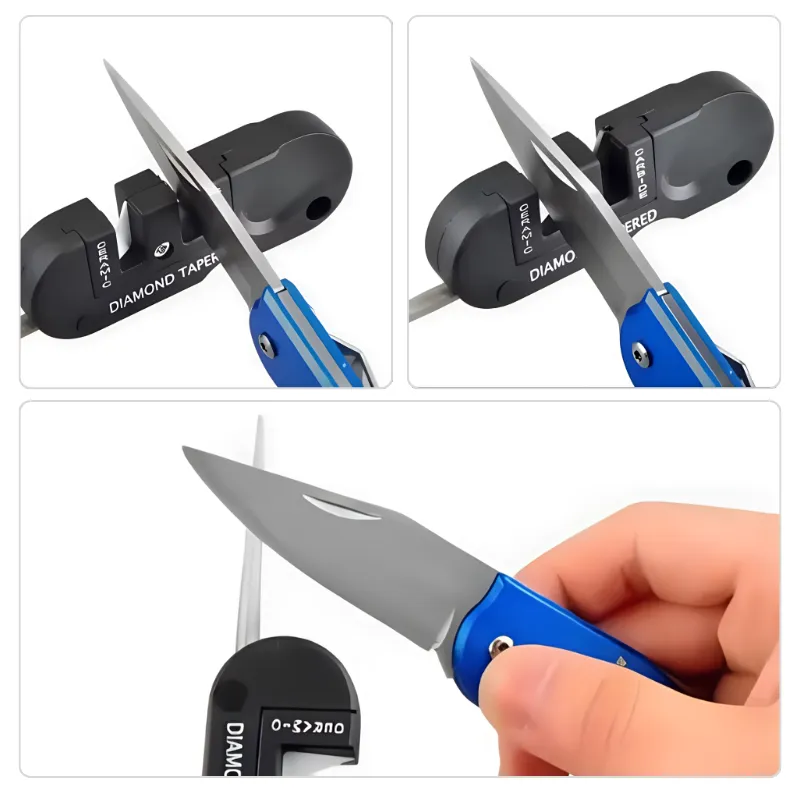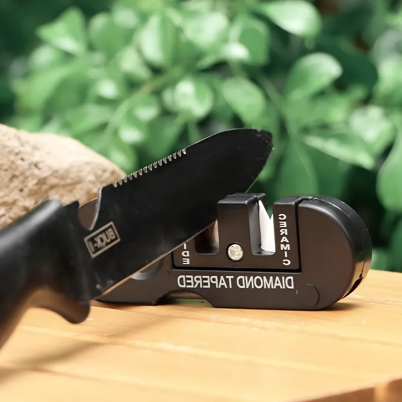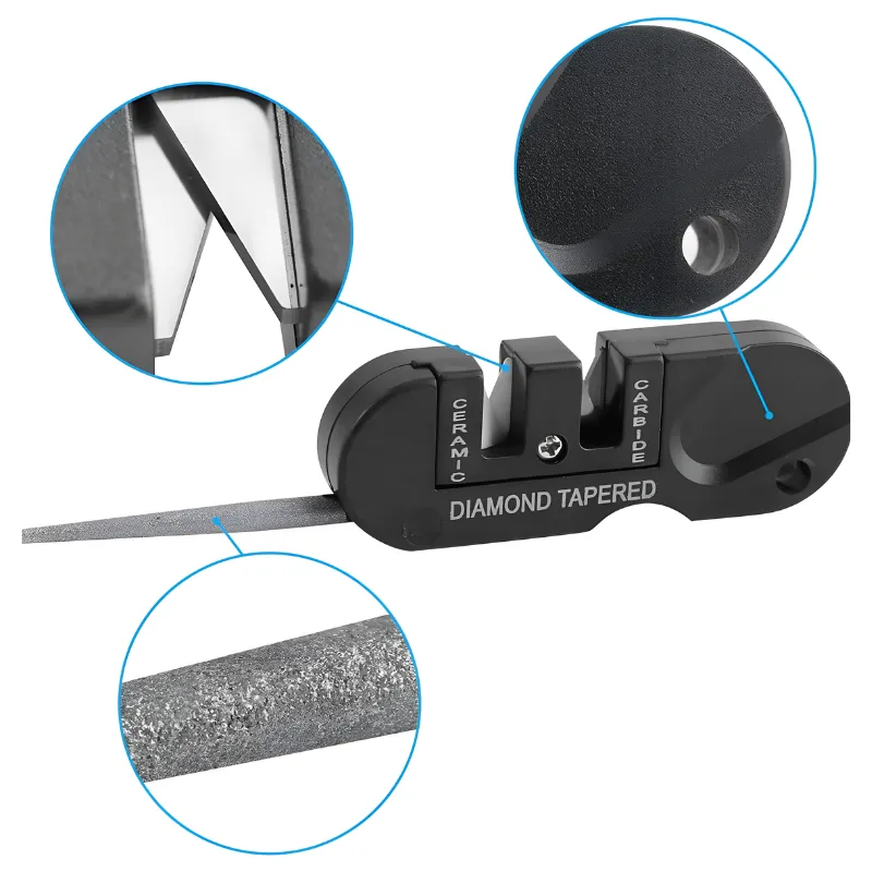 Threo 4-in-1 sharpener keeps edges ready for action in just seconds. Slip it into your pocket, bag, or hang it on your keys for quick access. Enjoy precise and smooth cuts whether cooking, hiking or camping.