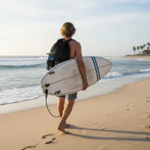 This swimming backpack keeps my gear dry thanks to the strong bottom. I throw it on wet sand and everything inside stays dry.