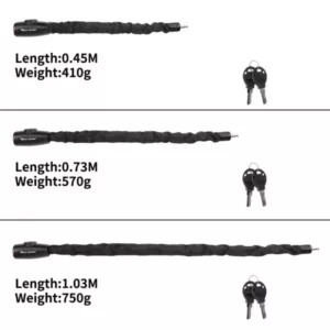 The upgraded lengthened bold with high-strength alloy steel is longer and more practical. It is available in different lengths: 0,45m – 1,45m. A crescent key effectively reduces the mutual opening rate and resists the means of thieves. This bike lock can lock several bicycles or motorcycles at the same time. Also, it can be used for ladders, gates, fences, toolboxes, sports equipment, and other important things. Perfect for chaining your bike to a tree or railing.