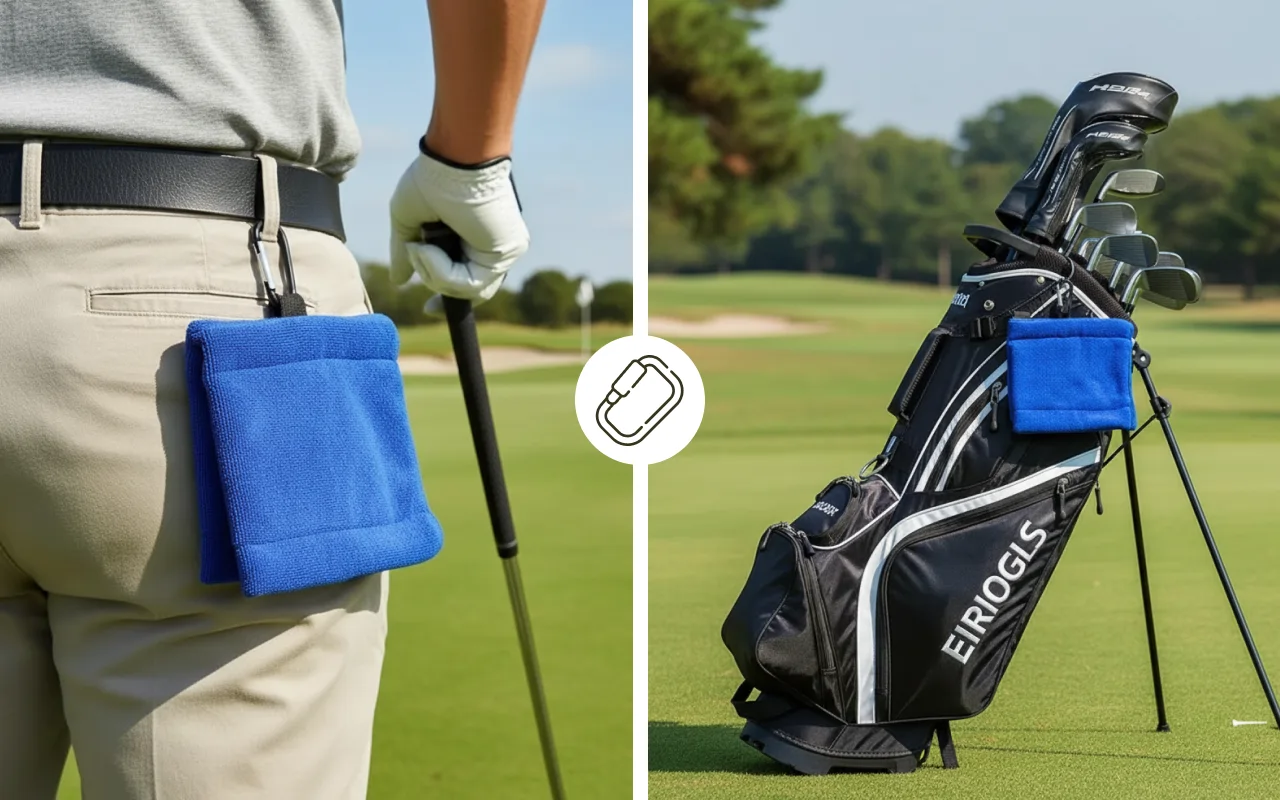 Really love the carabiner clip, attaches to my belt in seconds. The microfiber fabric is gentle but tackles mud perfectly on balls and clubs.