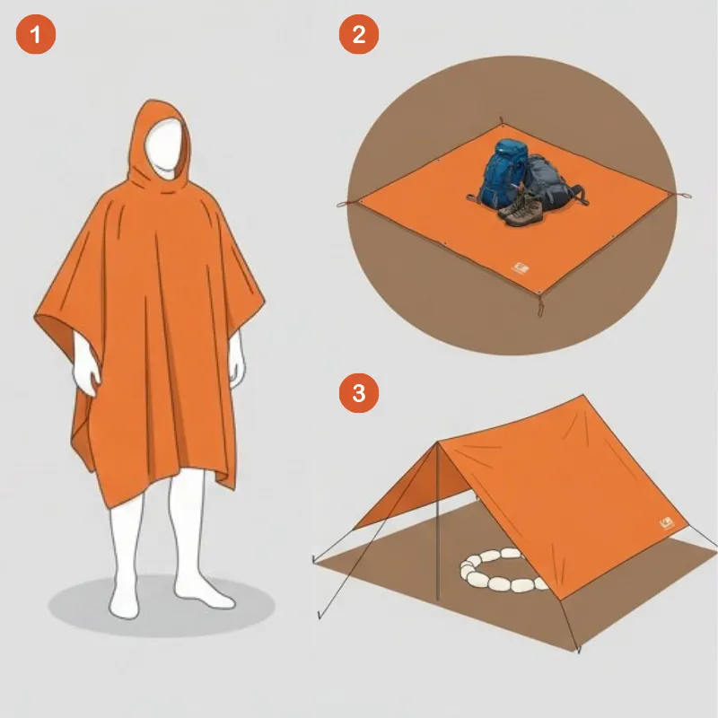 Change it from clothing to a handy groundsheet in seconds. You can also set it up as a shelter from showers or the sun.