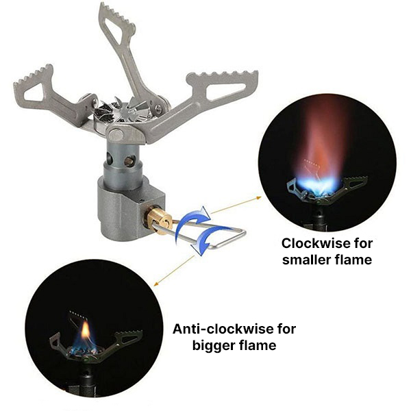 The installation of our mini stove is super easy, requires no special tools, and will only take you 10 seconds. Please, observe all precautions and do not allow children to use the product. Make sure the control valve is fully turned off before twisting the stove on. Firstly, tighten the mini stove valve on the fuel canister clockwise using your hands. Then, unfold the top 3 potholders. Finally, open the valve counter-clockwise and start using the mini stove.