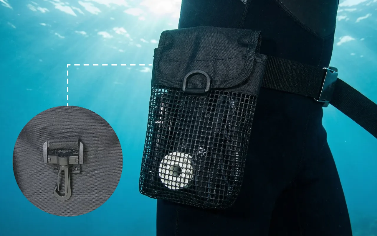 I love the durability of this mesh pouch. After many salty dives, the hook still snaps tight, and the material hasn’t frayed or weakened at all.
