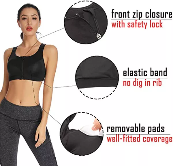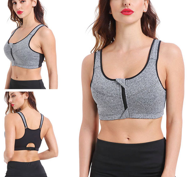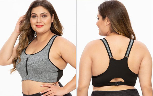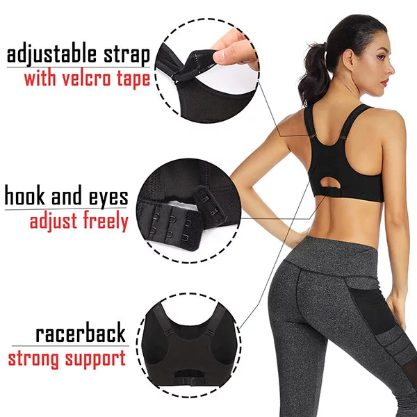I-shape back shoulder strap effectively protects against shock and prevents the bra from shifting or slipping off. The bra has an anti-slide zipper and hooks that protect from sliding down when doing exercise. Adjustable support band in the back, like an everyday bra with 3 sets of clasps, allows adjusting the cup size.