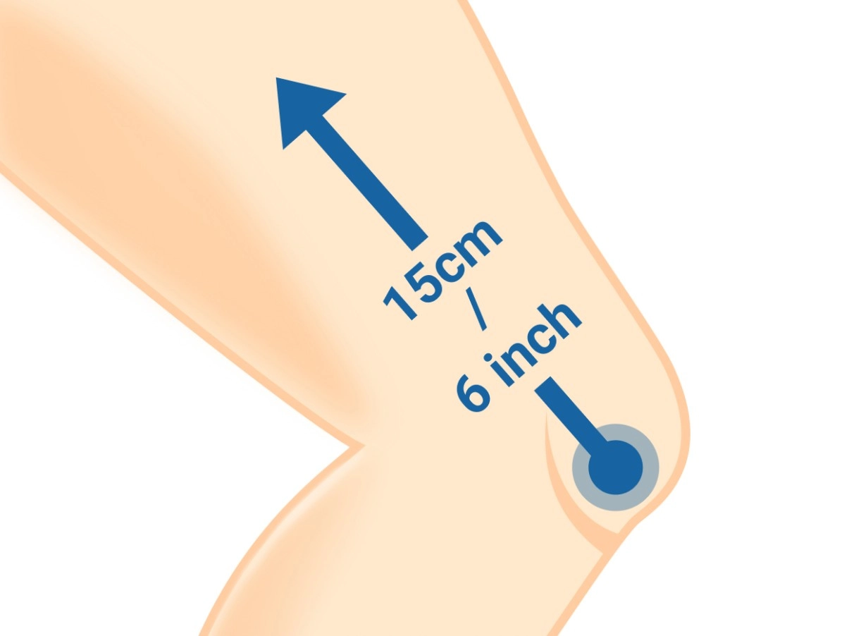 • 2. Wrap the measuring tape around the widest part of your thigh from about 15cm/6" above the midpoint of your kneecap.