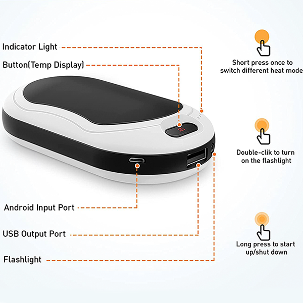 THREO Hand Warmers are made of high-tech and durable aluminum and ABS materials. Designed with a soft polyester liner, they keep the heat from escaping. Our hand warmers are also equipped with a 10000mAh battery, which allows continuous heating for 6-12 hours. Plus, they have a built-in intelligent protection system to prevent overvoltage and short circuits.